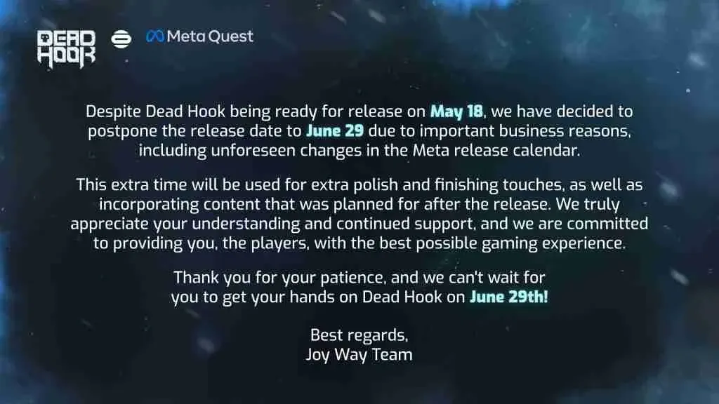 Despite Dead Hook being ready for release on May 18, Joy Way have decided to postpone the release date to June 29 due to important business reasons, including unforeseen changes in the Meta release calendar.
