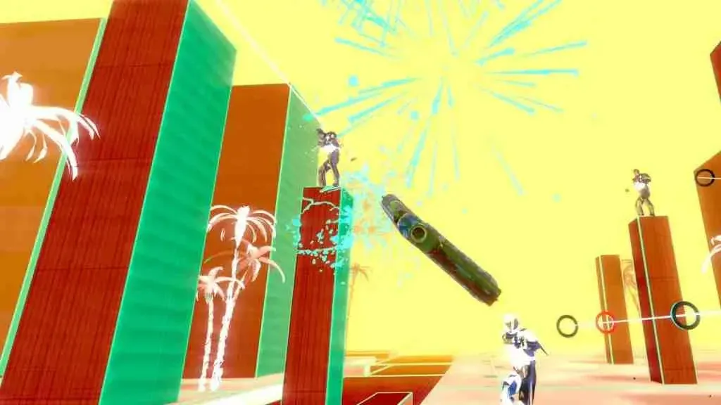 Letting Go - EMBERZ: Players dance and shoot their way through showers of stars and rain in this upbeat transitional journey above a dreamy pastel cityscape.