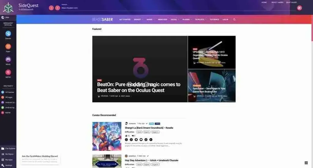 Aside from the VR Games and Apps sections, there is much more hidden inside of Sidequest. A library of android 2d games, an NSFW section, and a few other hidden settings. But for me, the most enjoyable part of Sidequest is BeatOn. BeatOn is a beautiful application that brings an entire library of thousands of user-created songs and mods to Beat Saber. Yes, Beat Saber is nothing new, and neither is the modding community, but what this allows us to do is take full advantage of all of this content on the Quest, and very easily I might add. You simply browse the songs and mods you want, click the download icon, and sync to your headset. I've found so much enjoyment out of playing Disney songs, Michael Jackson, and 21 Pilots on my Quest. (“You're Welcome” from Moana is a personal favorite)