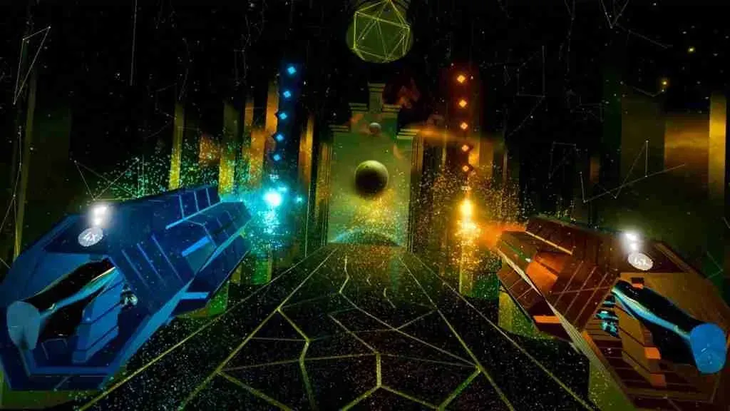 Rather than trying to put you in the shoes of a guitar god, Audica goes for the kind of healthy abstraction first deployed in Amplitude. In VR, you are a disembodied presence with only hands and guns which have blades running down the sides. While standing in a stylised cavernous space, you shoot incoming targets corresponding to the colour of each hand, as close to the beat and as close to the centre of the target as possible. Some targets must be 'held' by keeping the trigger depressed, letting a stream of energy lock on and be swirled around so the player can change the pitch of the note. (This feels very close to what I'd imagine using one of the proton wands in Ghostbusters would feel like were they real). There are also spinning mines to hit, resembling malevolent disco balls, and targets which spawn little tails to follow with your beam, creating additional beats. That's the basics, and you're introduced to them with a no-nonsense, highly effective tutorial which acts as the perfect, hors d'oeuvre for the main course.