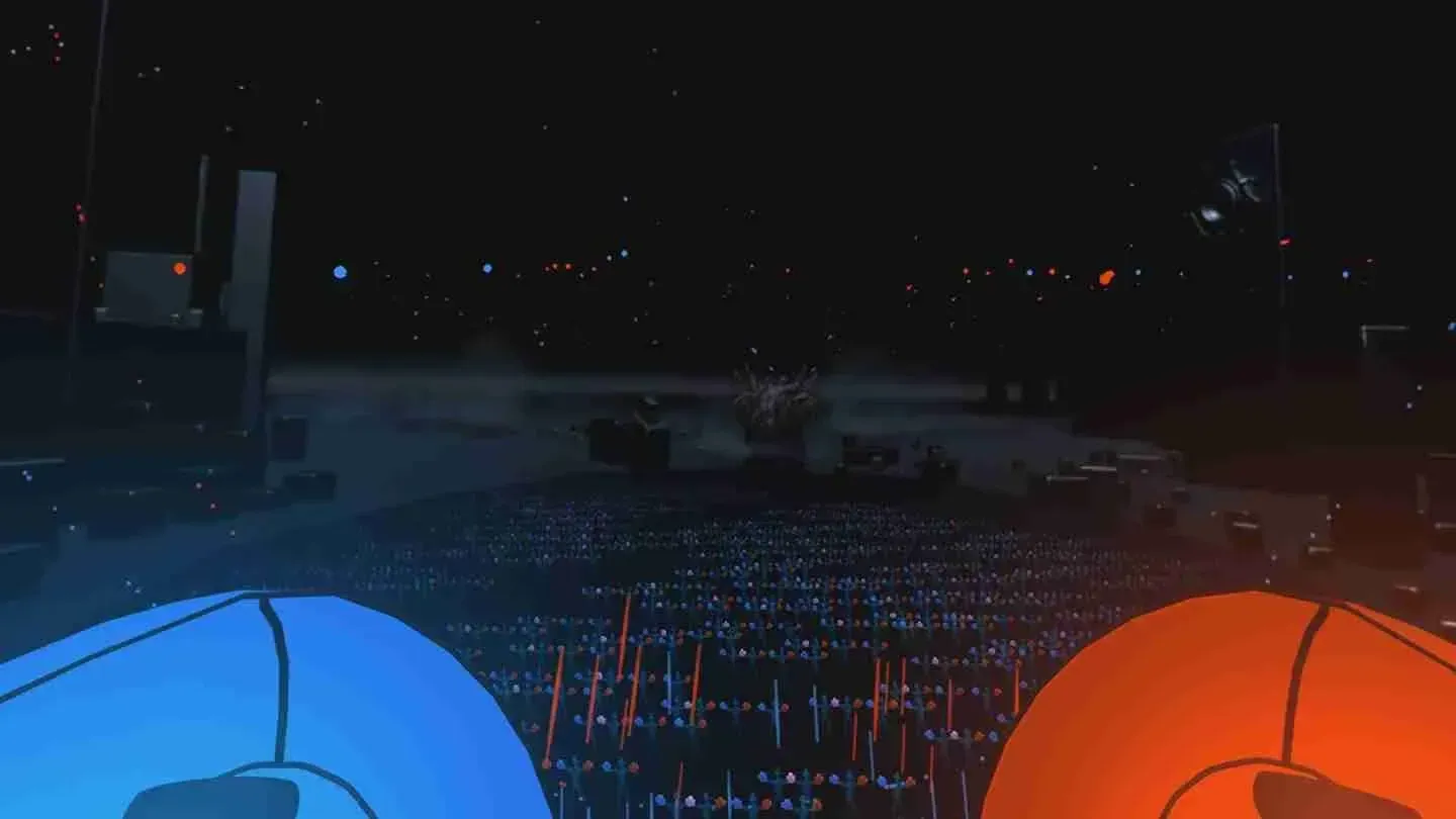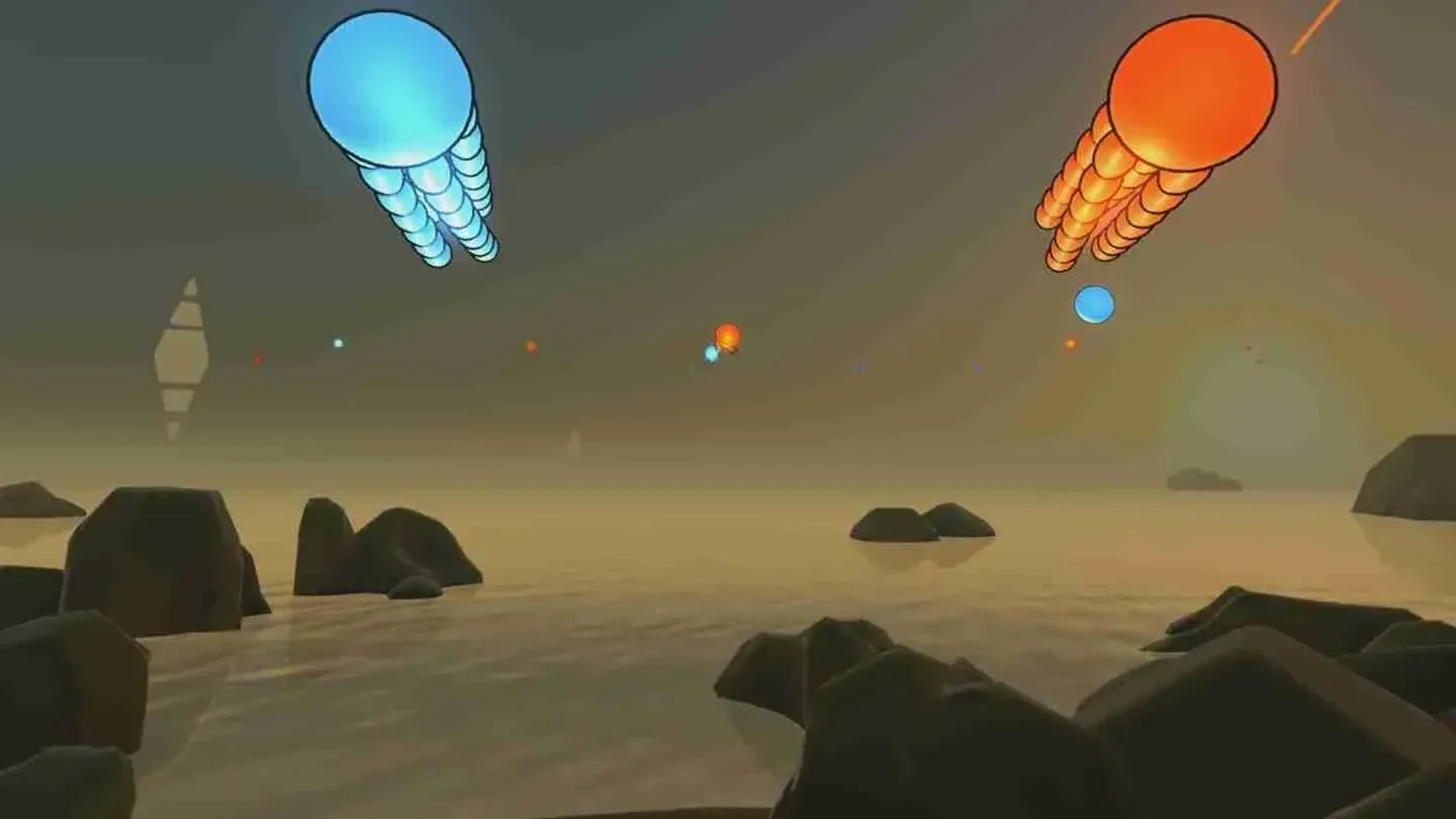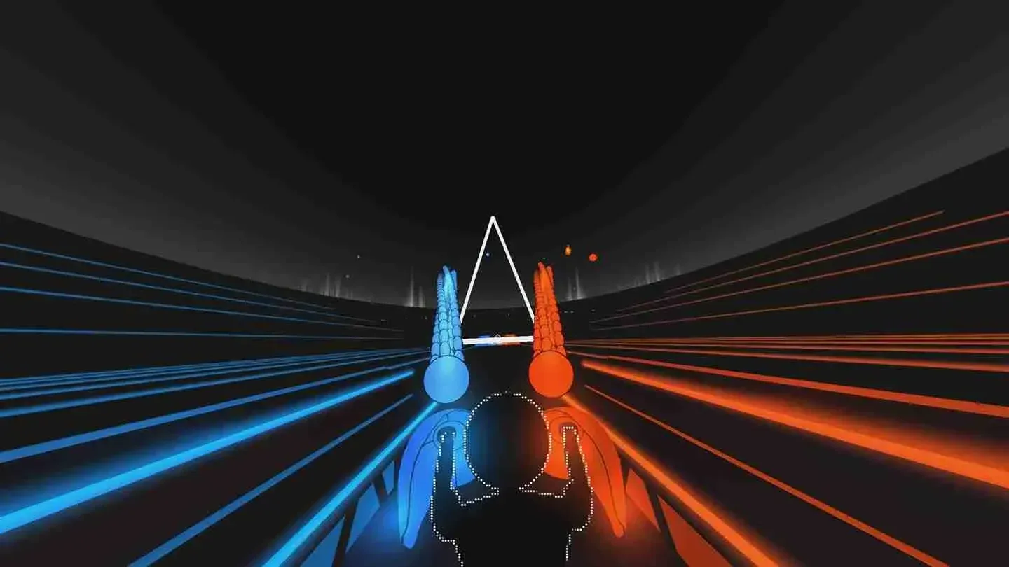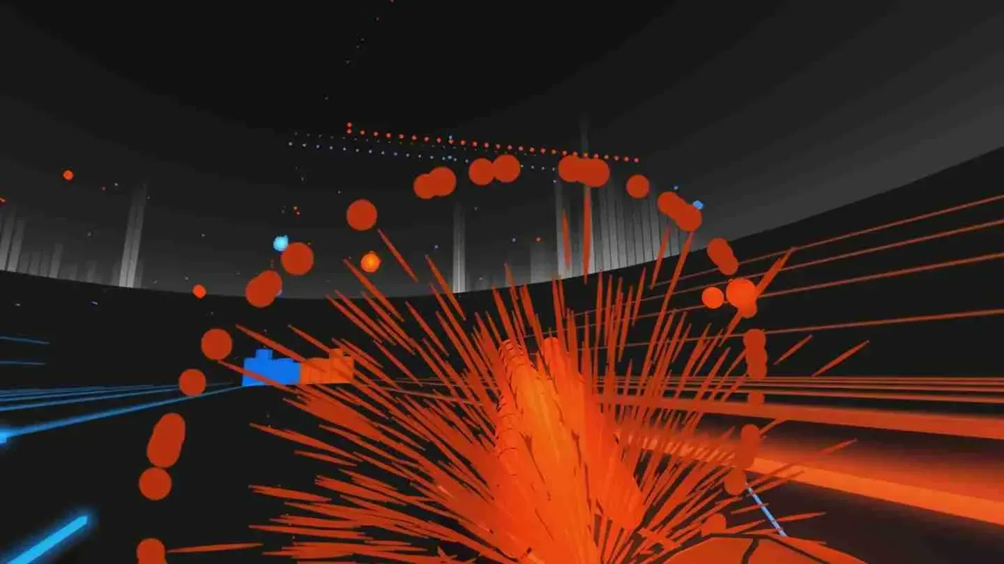 The orbs themselves are animated well and are satisfying to look at, especially because they explode on contact. With every orb or orb trail you block with one of your shields, you get haptic feedback from the controllers. The higher the difficulty, the more orbs appear, and the trickier the orb patterns get. Missed orbs are indicated by red and blue flashes on the side of your field of view, and you always have a wide view of the next pattern that's waiting for you after the one you're clearing. The orbs always rain down on you with a slight downward angle, and you might want to check the horizon frequently to prepare for the next waves. The Fitness modes provide glowing triangles for you to duck under, thereby introducing squats to the gameplay. If you get into AudioShield, you'll get sweaty pretty soon!