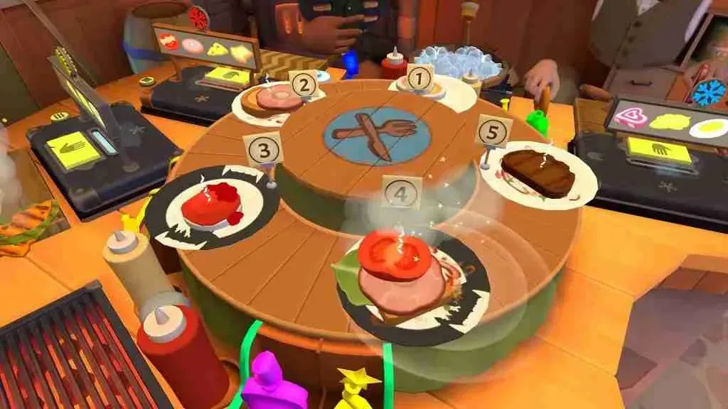 Where the fun really, and I mean really, kicks in is in multiplayer. Cook-Out, like Overcooked! before it, revels in its multiplayer chaos. When played online, whether with friends or with strangers online, it's a beautiful, hilarious, chaotic frenzy of cooperation. You'll all be telling each other what's needed next, what you'll prepare, and what they need to prepare, congratulating yourselves when you do well, and trying to come up with strategies to coordinate yourselves better. It's engaging, and it's friendly, and it's a joy to play. Also, people will squirt ketchup and mustard at you - get used to that! When played with your significant other (assuming they also have a Quest), well, let's say it'll test your relationship as you shout orders at each other, blame each other for any mistakes or delayed orders, and generally turn into the worst version of yourself. Did I say it was fun? It is!