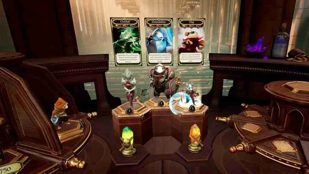 If you've played Moss 1 or Moss 2, then you've already experienced the colorful cuteness that Polyarc so graciously and deliciously pours wholeheartedly into their creations. Glassbreakers is no exception. The champions' character designs and animations are easily the star of the show here. They're animated beautifully and exhibit a great deal of character. It's easy to fall in love with all of them, and so, yes—even grown men, especially Pete, like to dress them up in different skins and colors and change them up to see which teams form more formidable combos. It's all good, clean fun.