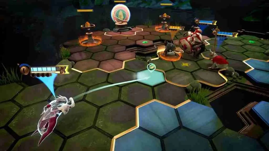 Now the game has much more nuanced mechanics. Your characters get stronger as they land more kills during the game, giving it a momentum-based angle. The more you win, the easier it is to win. So you're on edge all the time, trying to eke out kills without getting killed yourself. It's a delicate balancing act, which really gives the game a strong ebb and flow as you land a kill or two, then rush back to the base to defend yourself and heal. But the hexagonal map itself has power-up spots that, if you occupy, can spawn power-ups that augment your health, your attack strength, or your special ability cooldowns. So you're also driven to race and fight for those. Once spawned, you can give them to any of your characters, each of which can be equipped with four of them.