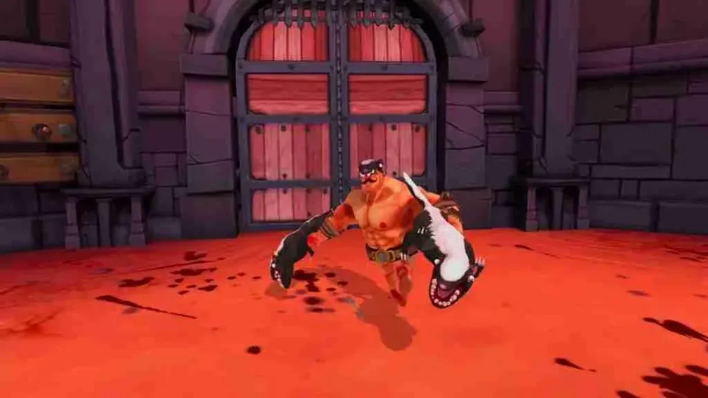 Once you’re inside the arena, it’s a fight to the death against waves of foes. Grab an ax or club and swing it around, and it wobbles and bends like it’s made of rubber, or one of the looney-toon weapons from Who Framed Roger Rabbit. When your weapon connects with an opponent, you’ll often see flying teeth, eyeballs, and blood spatters, along with a sickening thud or squish. You can even pluck out an enemy’s heart and beat them to pieces with it.
