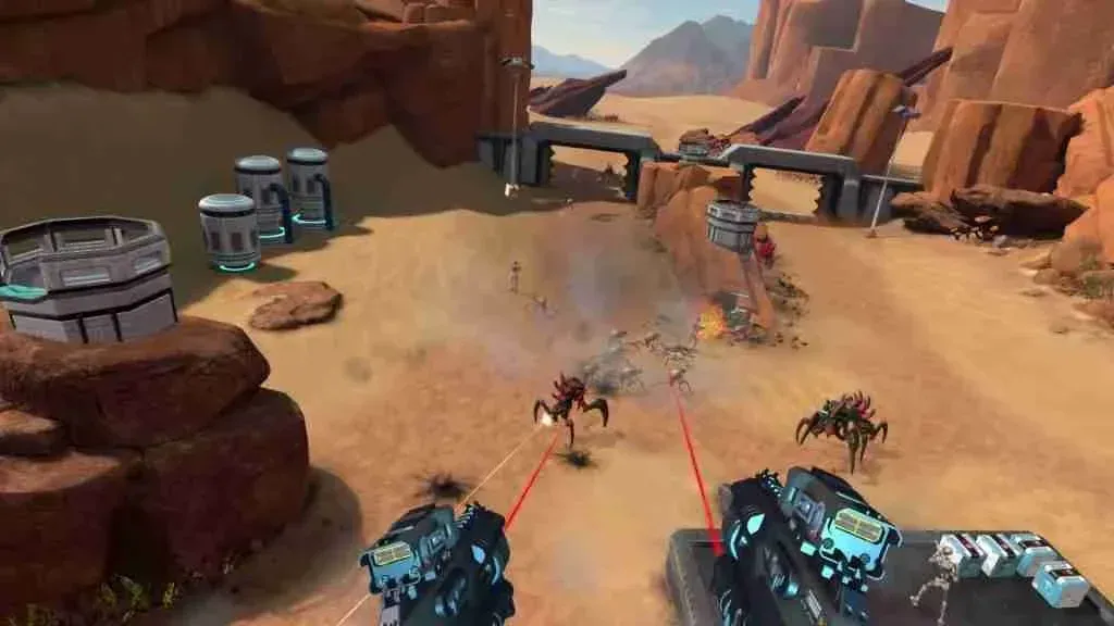 Guardians VR hides its Early Access standing well in most areas, but it does feel like there is more work to be done on the graphics than in any other area. The visual world of Guardians VR is perfectly acceptable, although a little on the bland side. It would seem that to keep the maps large and open and the bugs fast and flowing, the developers needed to choose some somewhat dreary settings for the action to take place. Whilst this isn't a big complaint, the two worlds available at launch are desert and snow themed, respectively and create large expanses of somewhat flat, uniform terrain. It's perfectly functional and doesn't hinder the gameplay, but it's far from stunning.