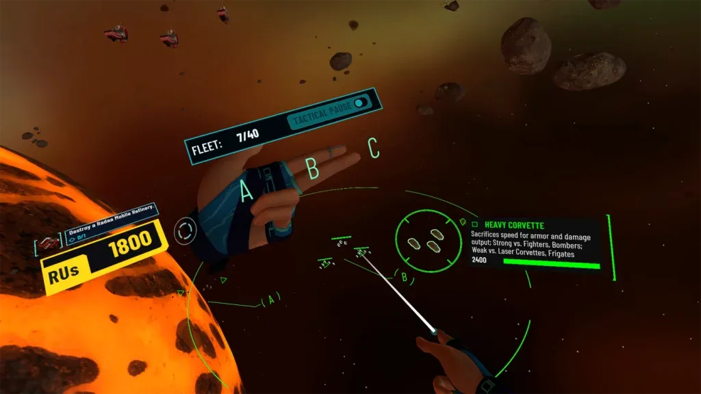 Despite all the ships having a decent amount of detail, the scale at which you command your fleet is so vast that you seldom see them up close. The best tactical vantage point reduces your highly detailed ships to tiny dots that you command around an uninteresting patch of empty in a way that robs the physical world of resonance with the gameplay. I was playing the game at a scale that made it more difficult to make clear strategic decisions that feel connected to the world, a compromise which detracted from the overall experience. There is a Mixed Reality mode, but it offers nothing new other than changing the background to your actual space, making it more difficult to find and control your ships.