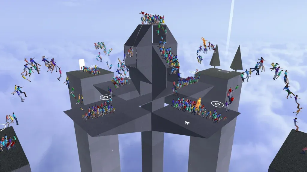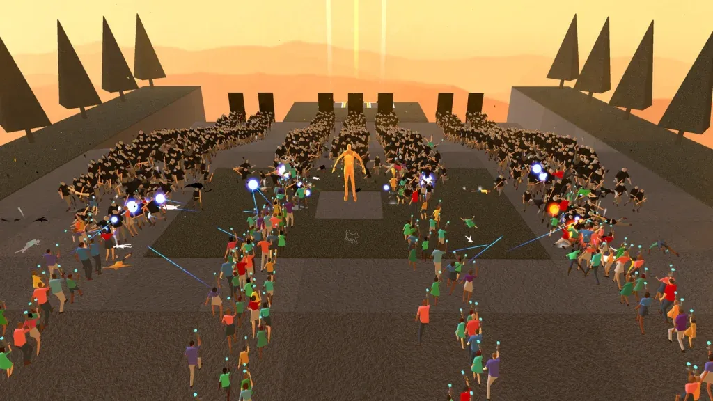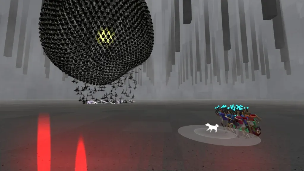When I said throngs, by the way, I wasn't exaggerating. If there's one thing Humanity impresses you with right away, it's the sheer number of humans it can casually fling on screen simultaneously. Masses of humans emerge, and they keep coming, hundreds of them, sometimes thousands. The game appears to be able to push them out in limitless quantities. I remember first playing this game on PSVR2 when it came out and thinking it took the power of a PS5 to throw around this many animated bodies. When I heard it was coming to Quest, I had my doubts about whether this turbas flagrantes could be accomplished on Quest. Well, guess what? The teams Tetsuya Mizuguchi and Yugo Nakamura led have somehow done the job. Humanity, meet Quest. Quest, meet masses of human sheep led by a Shiba Inu.
