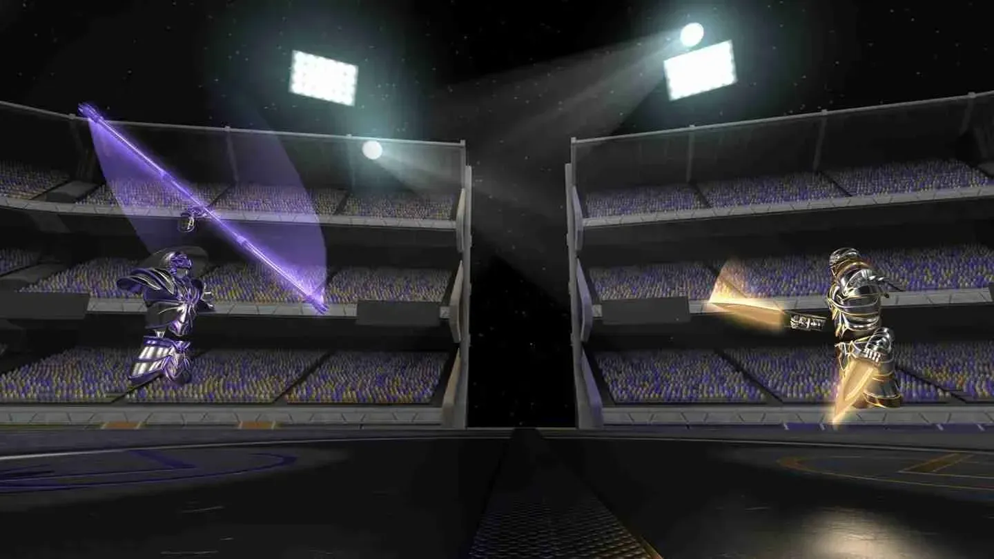 When a round of combat starts, you find yourself on your half of a large platform. The platform moves in space until it comes to a satisfying thud as it meets its other half in the middle of a large arena, surrounded by a large, minimally rendered crowd. This is your battle arena, and you better get used to it, because apart from some minor variations, it's all you've got. You find yourself face to face with your enemy or enemies, and your weapons come flying across the arena, to land in your hands. A large screen announces the combatants, there's a brief countdown, and you're off to battle.
