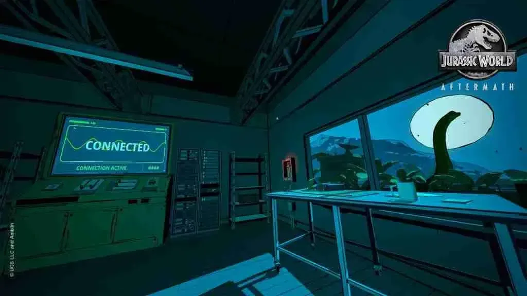 Jurassic World Aftermath is a combat-free narrative first-person game with light stealth elements. It's set in-between the events of the films Jurassic World and Fallen Kingdom, apparently, and features characters old and new. At the outset of Aftermath, the player is trapped as their plane crashes into the dinosaur-replicating facility on Isla Nublar after being attacked by inquisitive pteranodons. At the facility, in the grand tradition, things have gone Terribly WrongTM. Equipped only with a radio, the player must follow the orders of Dr Mia Everett to get some of the besieged facility's systems back up and running and escape.