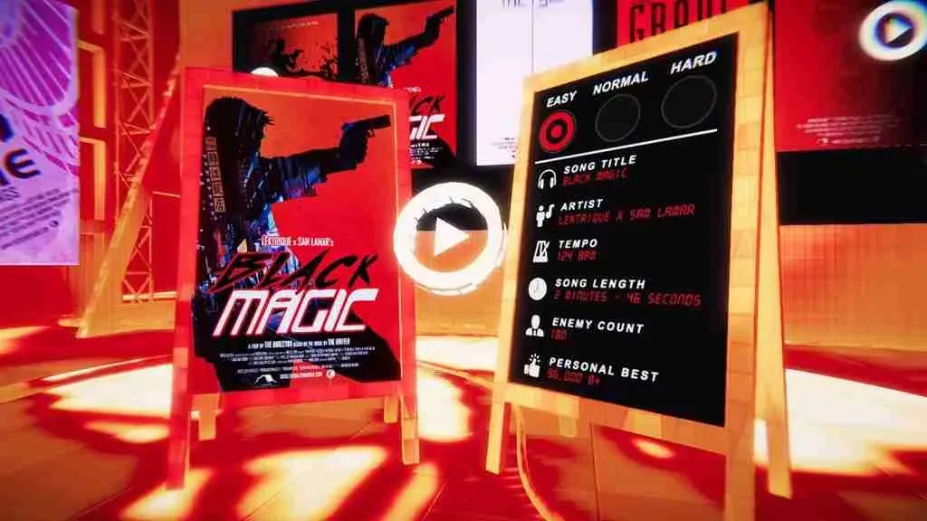 By this point, VR is becoming primarily the premier consumer electronics method of pretending you're Keanu Reeves. Of all titles available on the Quest, Pistol Whip gets closest yet. It wants you to feel like you're starring in a cool, stylish action film. The opening screen of the game stands you in front of a pulsating cinema box office, gun in hand. You shoot a poster, and a sexy voice breathes 'Pistol Whip' at you; almost an offer, or an invitation. Rather like Left 4 Dead, the levels are presented as film posters, all of different identities and flavours. There's an aluminium briefcase to your left containing different handguns to pick from. To select something, you shoot it. You shoot everything. It's the perfect hors d'ouevre for what's to come.