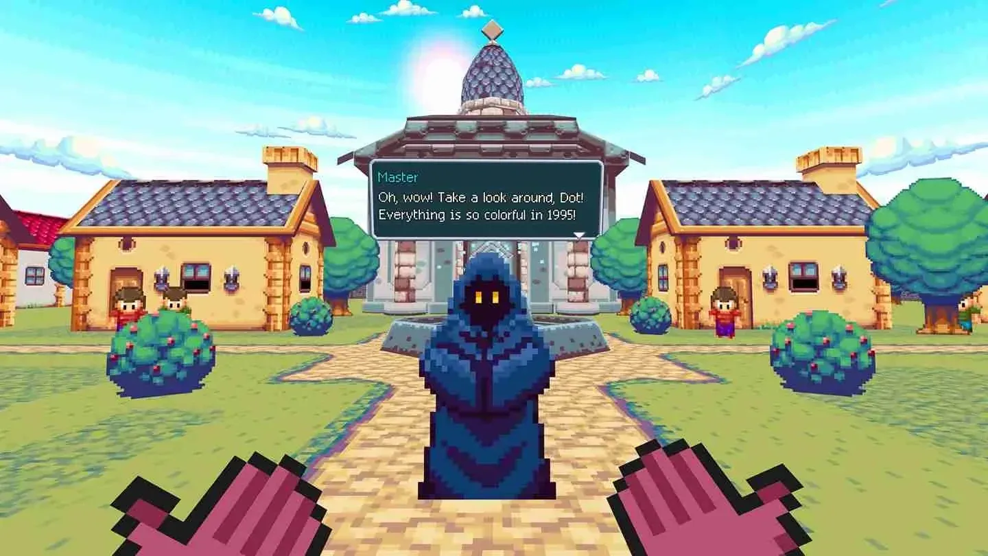 There are two worlds in Pixel Ripped 1995. One is the 'real' world of 1995, represented in cute 3D animated fashion, like an early Pixar production, and the other is the world of the game inside the game, Pixel Ripped. In Pixel Ripped (the video game inside the game), you are Dot, a video game character reminiscent of Samus Aran from the Metroid series. Your game world, since Pixel Ripped 1995 is set in...well...1995, is a colorful, pixelated place with colorful characters. This world quickly comes under attack by the big bad Cyblin Lord, who steals the Pixel Stone and flies away on his pet dragon's back. Your aim, when playing as Dot, is to protect the game world from the Cylin Lord, defeat him, and retrieve the Pixel Stone, thereby restoring order to the game world! You are guided on this quest by the Master, your dark-robed guide who tells you what you should be doing and when.