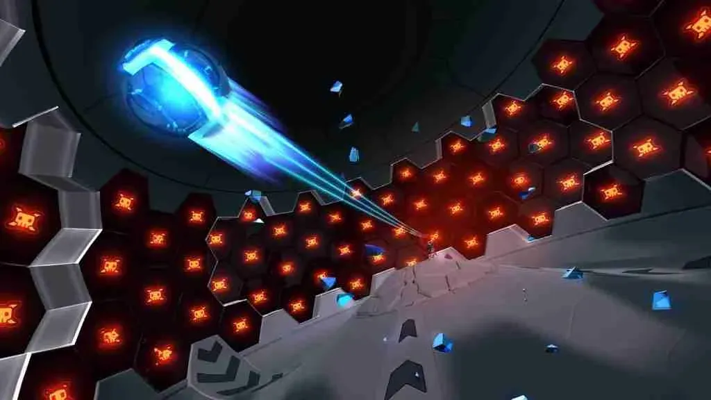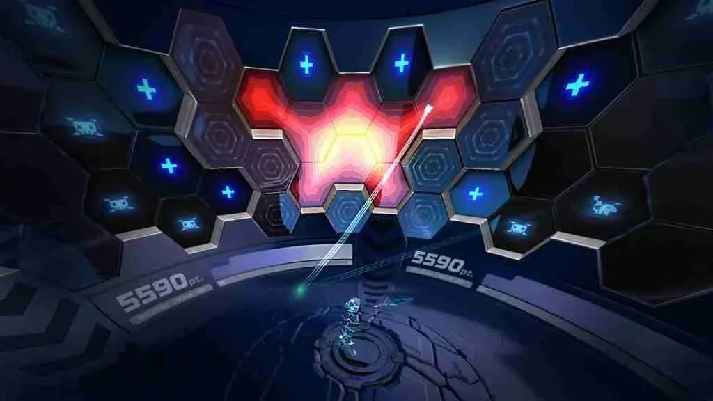 Your goal of the game is to hit all the targets before your time runs out. Your time is determined by an energy bar located near the bottom of the dome. If you hit boosters in the arena (represented as blue + signs), your time increases. If you hit the red-power draining hexes (that look like space invaders), your energy decreases, as does your time.