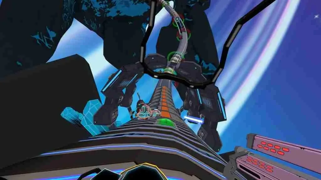 To reach the finish line, you have to hold down the accelerator the whole time, and I didn’t notice any advantage to braking into turns. Compare this to the essential drift mechanics in Death Lap, the most recent Oculus Quest racing game. In Radial-G, you can also boost with the A button, but the boost that shares a meter with your shield depletes quickly, and can rarely be refilled. As a result, you’ll often hear an in-cockpit voice announcing “warning!”