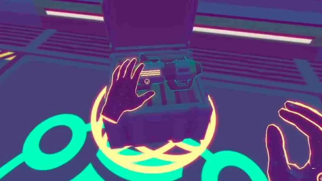 With no thumbstick, another solution had to be found for movement. Each procedurally generated floor is arranged in a grid with a node at the centre of each square. Reaching out with an open palm covering the node teleports you to it. The same gesture is used to activate switches and pick up objects.