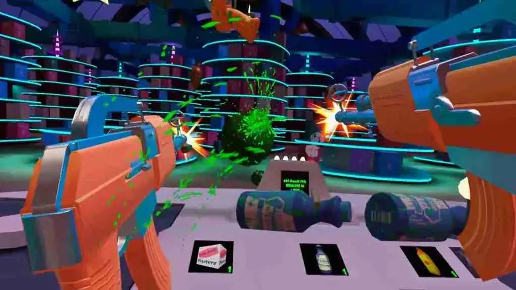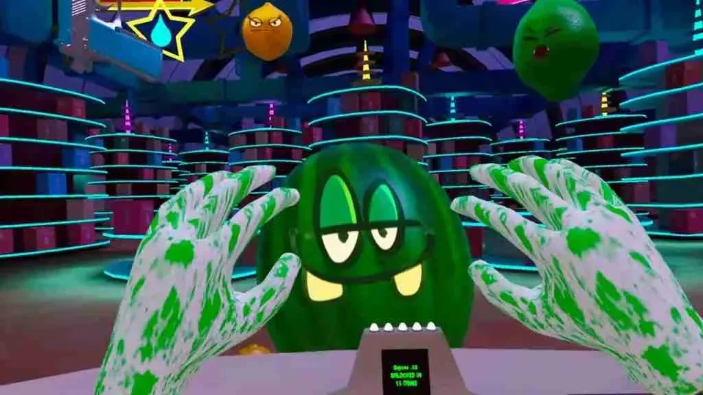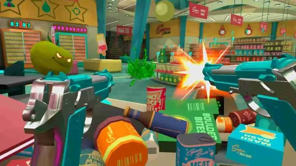 Aside from the detailed environmental design, the interactions you have with the different fruits are enjoyable and immersive. Shooting fruits that get too close will result in their juices being splattered over your hands and weapons. Unique attack patterns, varied facial animations, and movement styles give the fruits credible personalities. The atmosphere is accentuated by the contrast between silly fruit voices and grounded supermarket jingles.