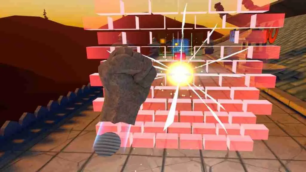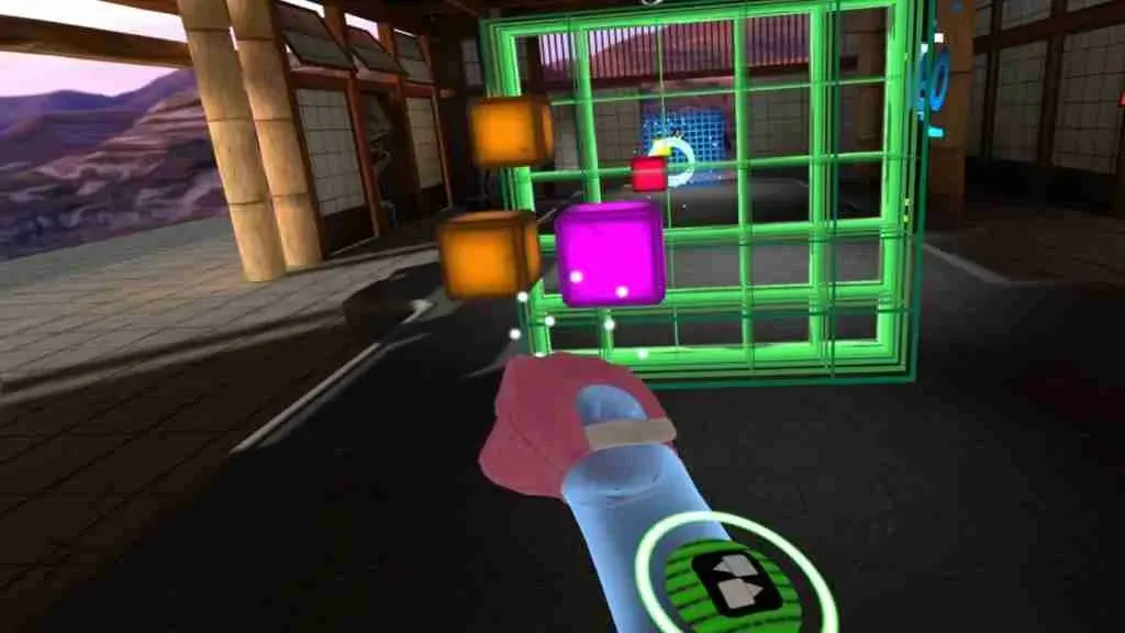 The aesthetic of Sucker Punch VR is somewhere between the gaudy colours and soft edges of Gang Beasts and the battered techno-future of Portal. Many of the environments are brightly coloured, and the object cubes cycle through loud rainbow hues. Alongside this, opponents are represented as hovering droids, and many of the powerup gloves have an electro-mechanical style. It's an odd mix, but it just about comes off.