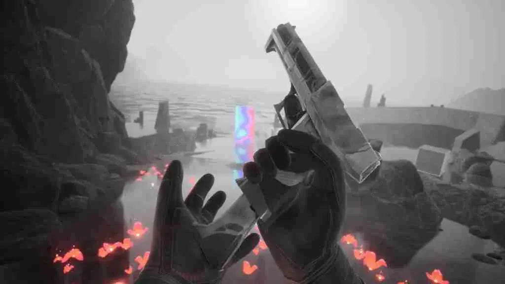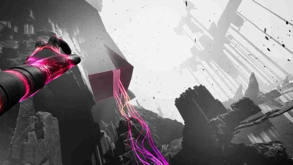 There are no two ways about it; Synapse is a looker. The monochromatic art style looks fantastic on PSVR2 and is excellently infused with orange, red, pink, and purple highlights that flawlessly draw your attention to the gunplay and telekinesis. The levels themselves are well-designed, providing ample opportunities for mobility without ever feeling lost. You also have a scanner inside your left palm, that you can glance at anytime. It'll show you where the enemies are and, once upgraded, where the health fonts are as well.
