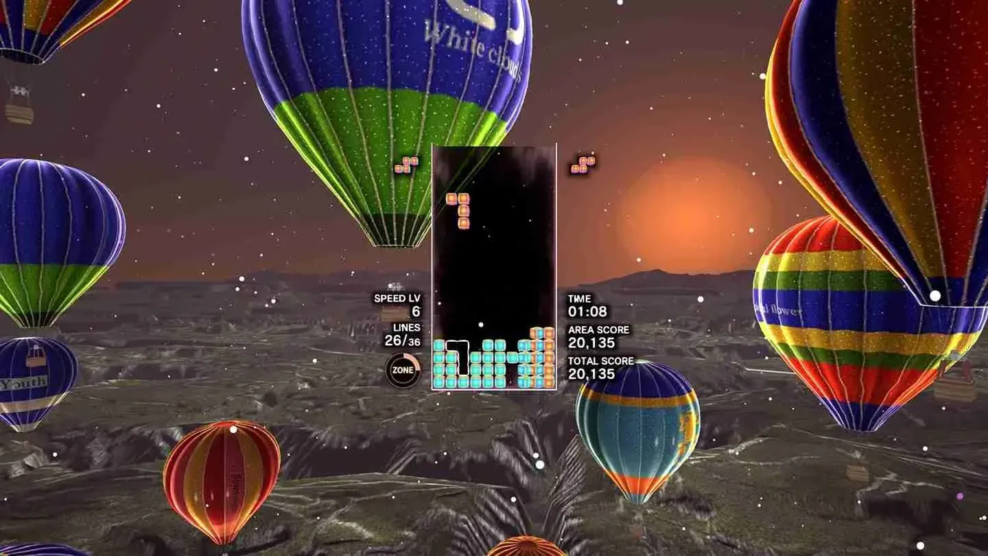 The core of Tetris Effect is the same as the original 1984 game. Same grid, same shapes (it feels wanky to call them 'tetraminos' so I'll avoid doing it), same mechanics. It adopts some of the more recent gameplay additions, like the 'swap pocket' to keep a piece in reserve, and the way shapes can be moved around quickly after placement. The most significant change, however, is the addition of the Zone mode, which can be charged by scoring points in the usual way and filling up the Zone meter. It's a nifty game-changer, which lets the player freeze the playfield temporarily, and stop completed lines disappearing. This enables some massive scores to be obtained by completing more lines at once than would usually be possible with 'normal' Tetris gameplay. It also helps the player to escape some tricky situations should it come to a game-threatening misplaced block or three.
