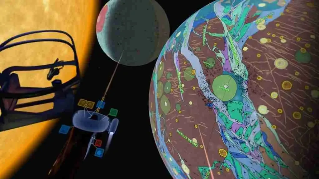 Titans of Space PLUS is an elegant guided tour of our solar system, stopping at planets, moons, and a few major asteroids. You are placed in a miniature spacecraft, with large windows that let you take in some epic views, accompanied by a dramatic orchestral score. At each stop, you can view some key facts, apply map layovers showing the terrain, and spin the globes or hold them in your hand for a closer look.