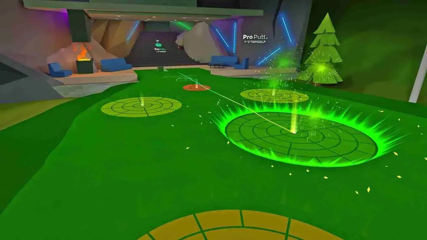 The Putt Lounge is set outdoors, under a starry night sky. A Low polygon fire dances next to you, and you hear low voices and chill music in the background. Behind you are a set of stairs and a set of low virtual couches. In front of you is a sort of driving range (putting range?) with goals painted on the green, set up for whichever one of the four mini-games you've chosen to play. There are four mini-games available in the Putt Lounge: Topgolf, Top Pressure, Quick Nine, and Quick Nine Pro. These mini-games are fast, challenging, and a lot of fun. They're tough without being discouragingly difficult. I could have played for hours, and I will probably go back to these again and again. The only thing I found strange was that these mini-games, in a lounge that looked designed for socializing, had no multiplayer option.